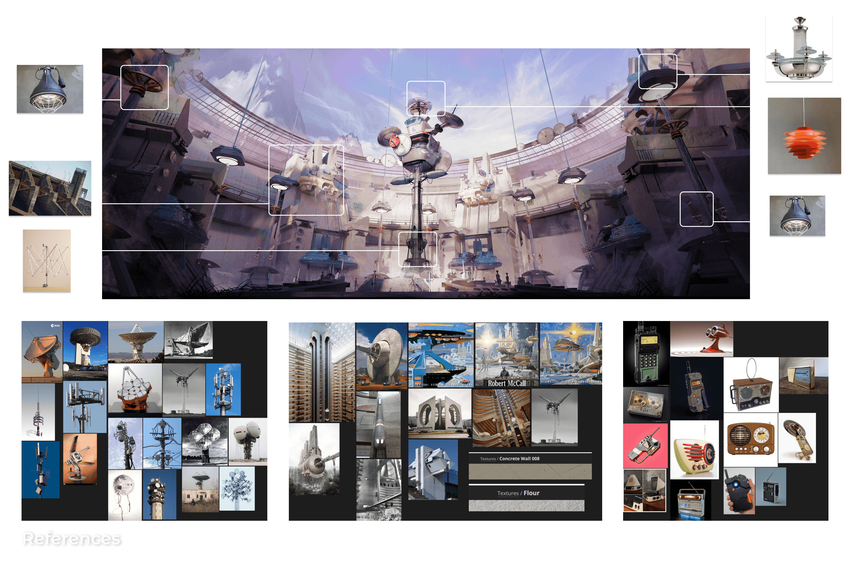 A sci-fi environment design visualizing a remote metropolis built to communicate with the stars. The concept is rooted in a retro-futuristic premise: humanity discovered that antique 20th-century radios serve as the key to capturing alien signals.
